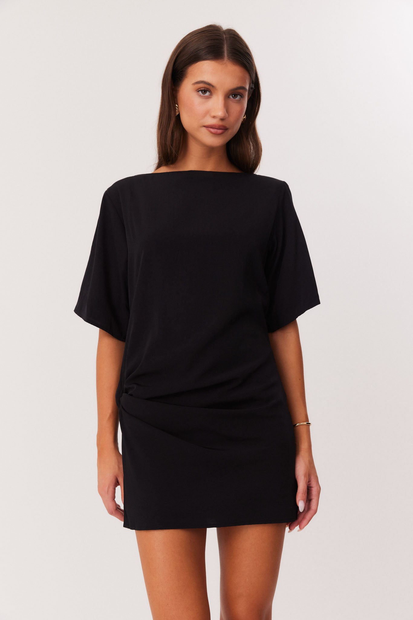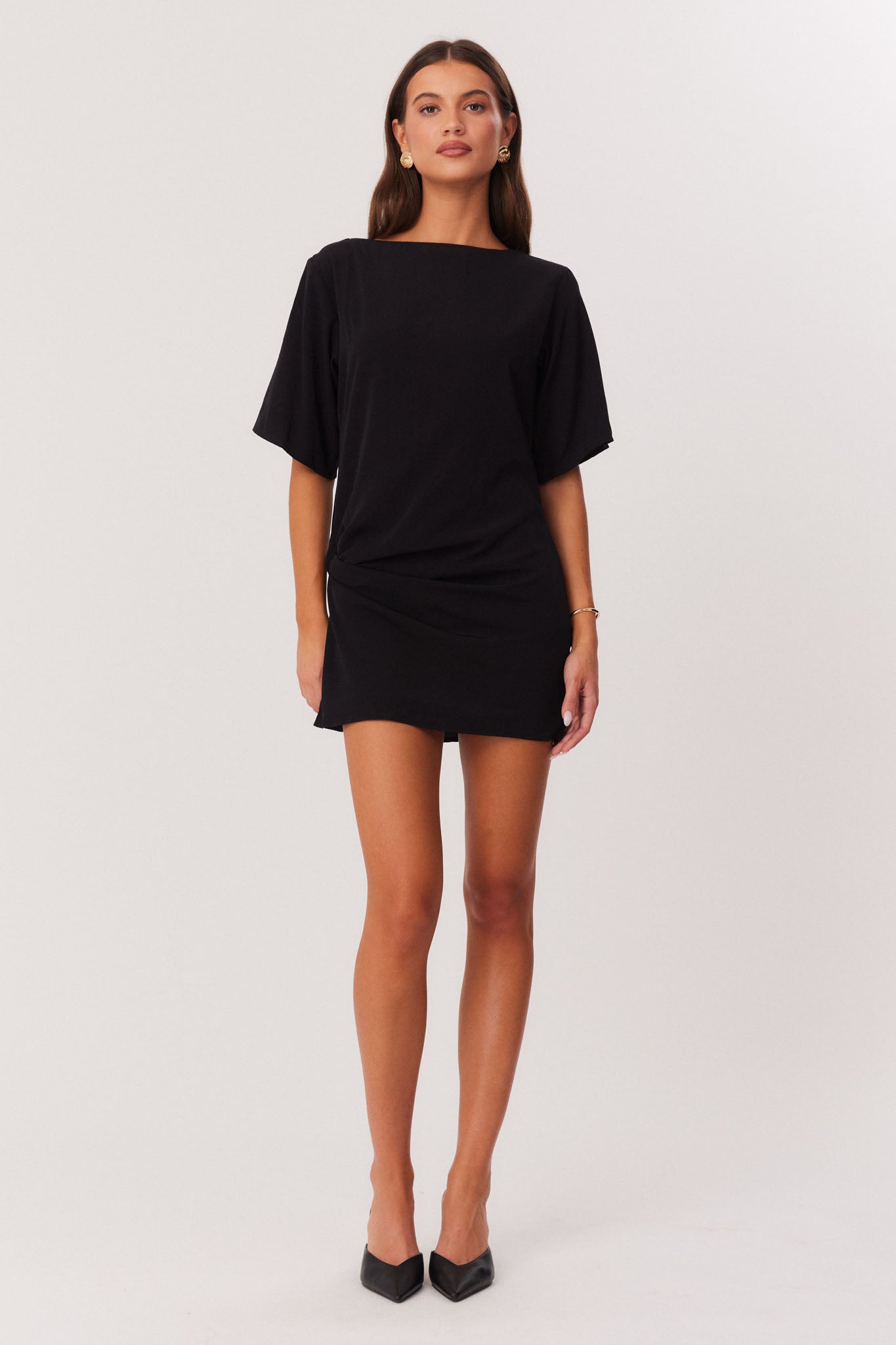 Mini length dress with high neckline and loose short sleeves