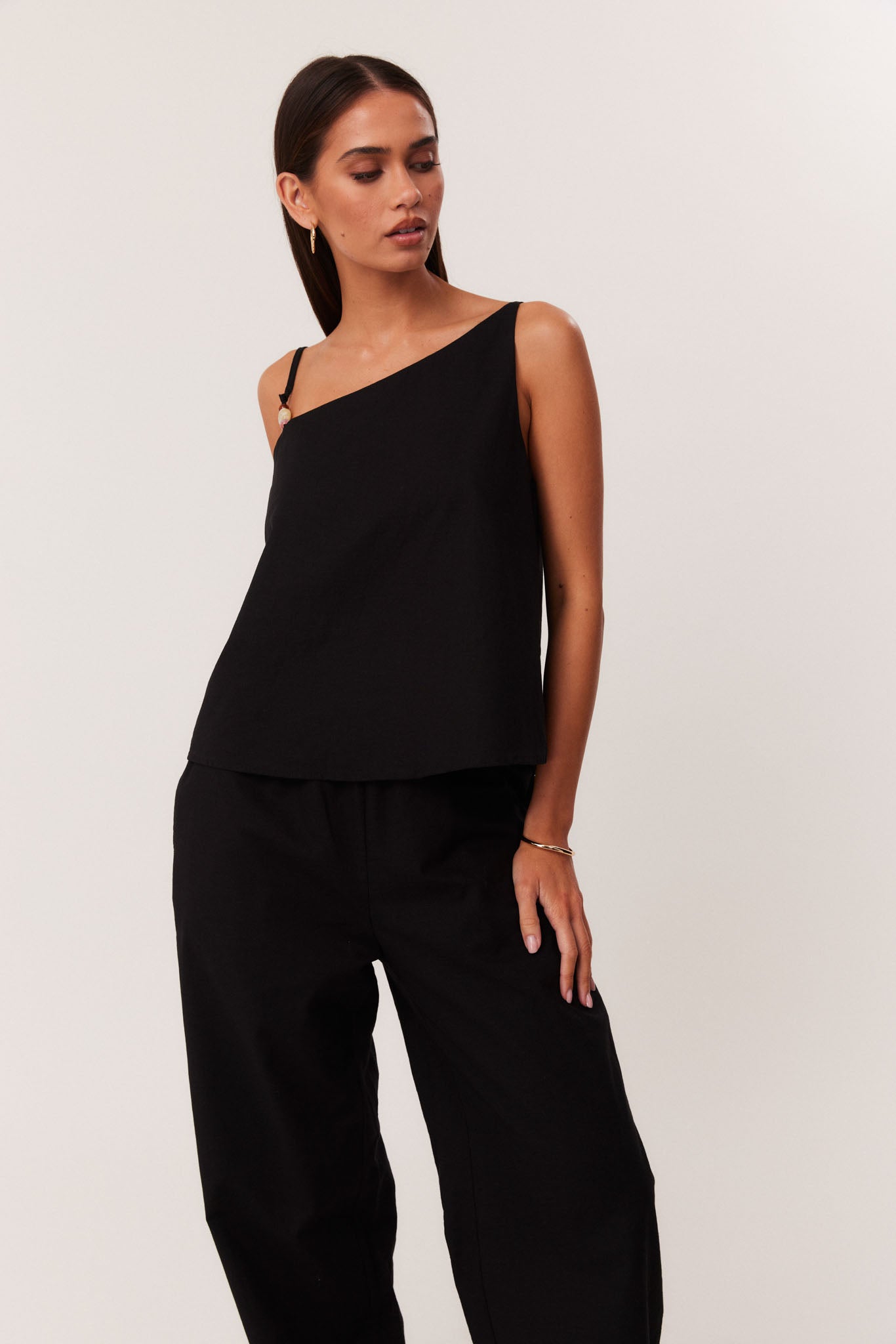 Asymmetrical neckline with bead detailing at shoulder strap