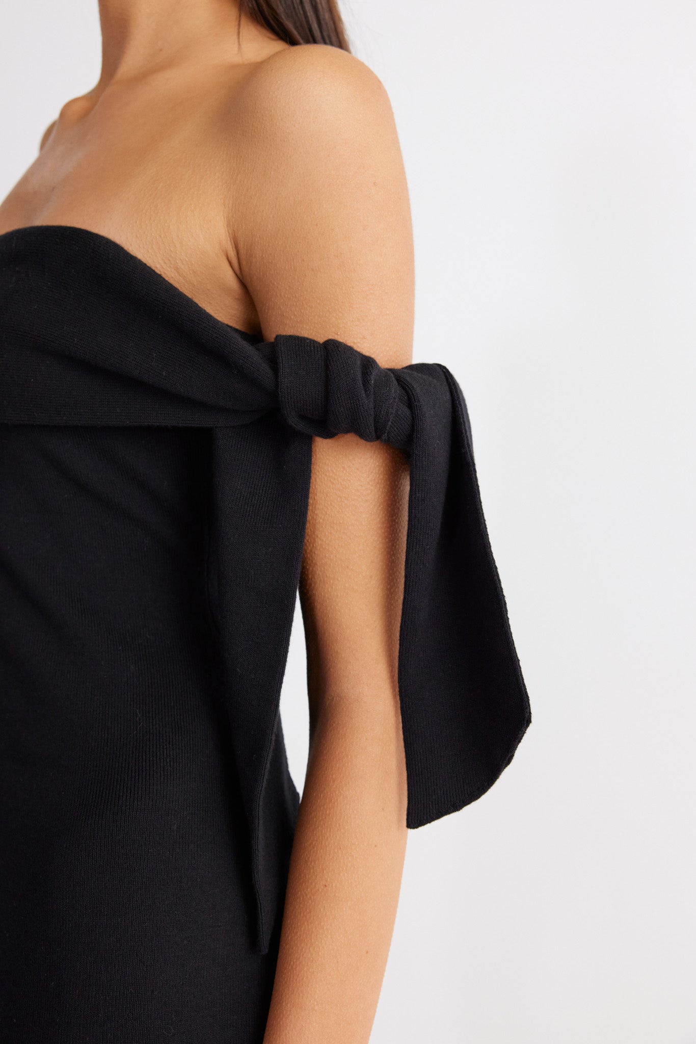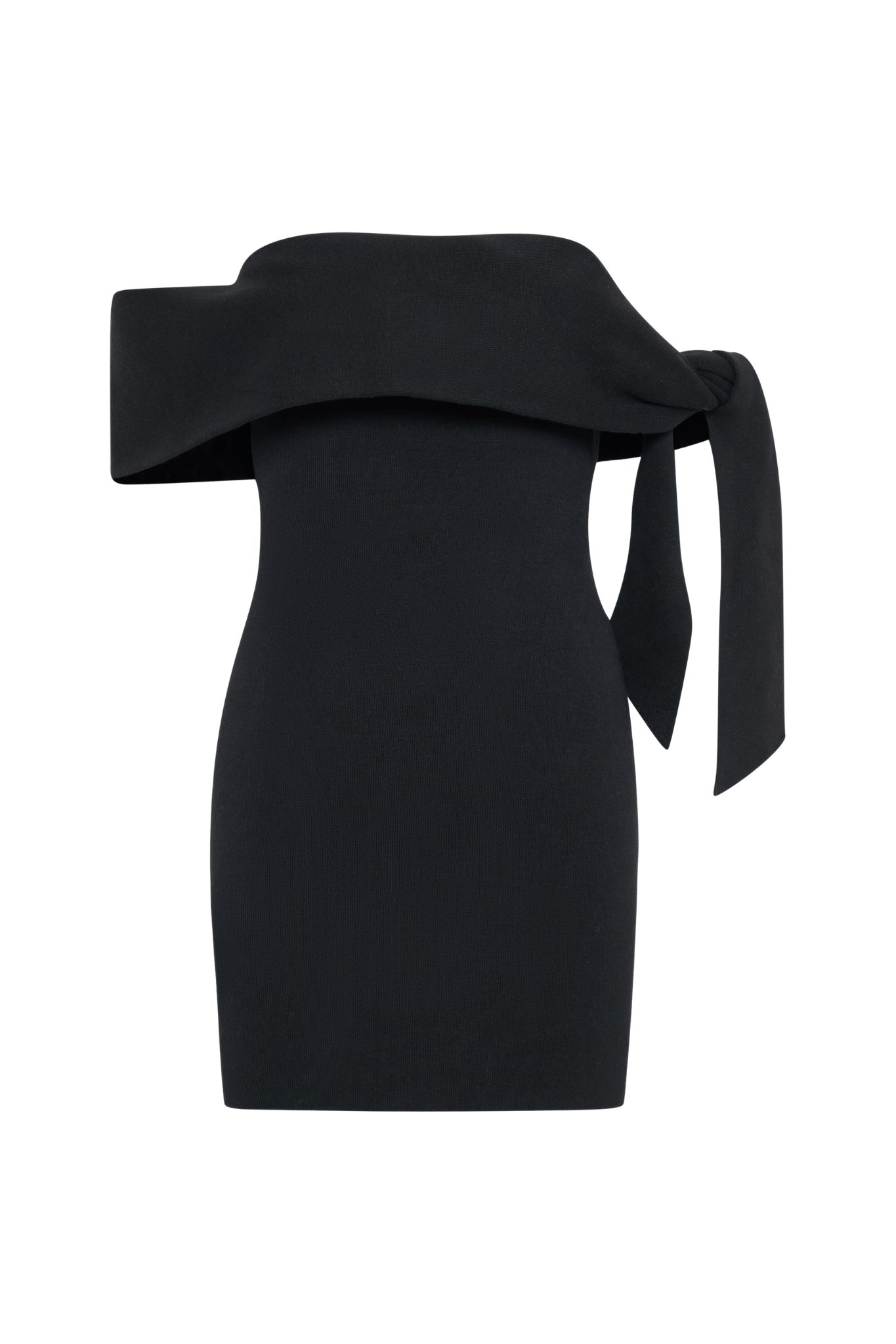 Folded off the shoulder feature with soft fixed tie at the arm. Please note the tie position may vary