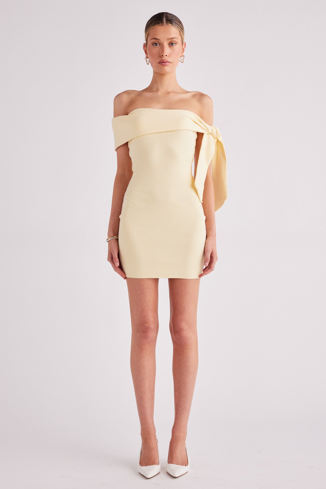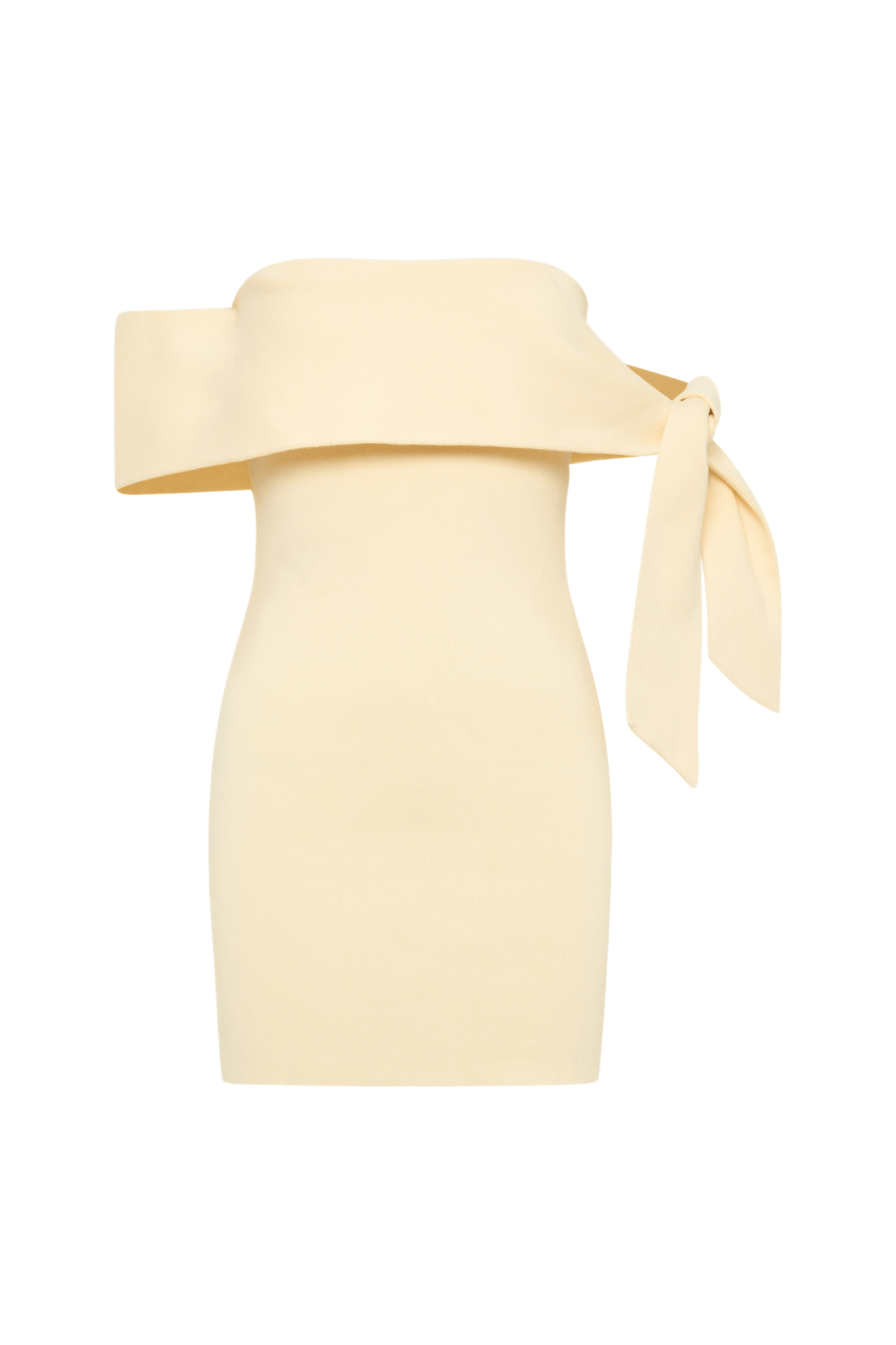 Folded off the shoulder feature with soft fixed tie at the arm. Please note the tie position may vary