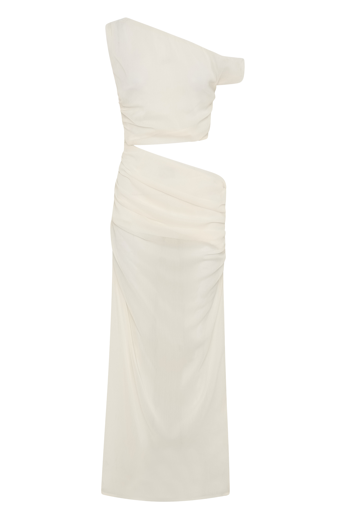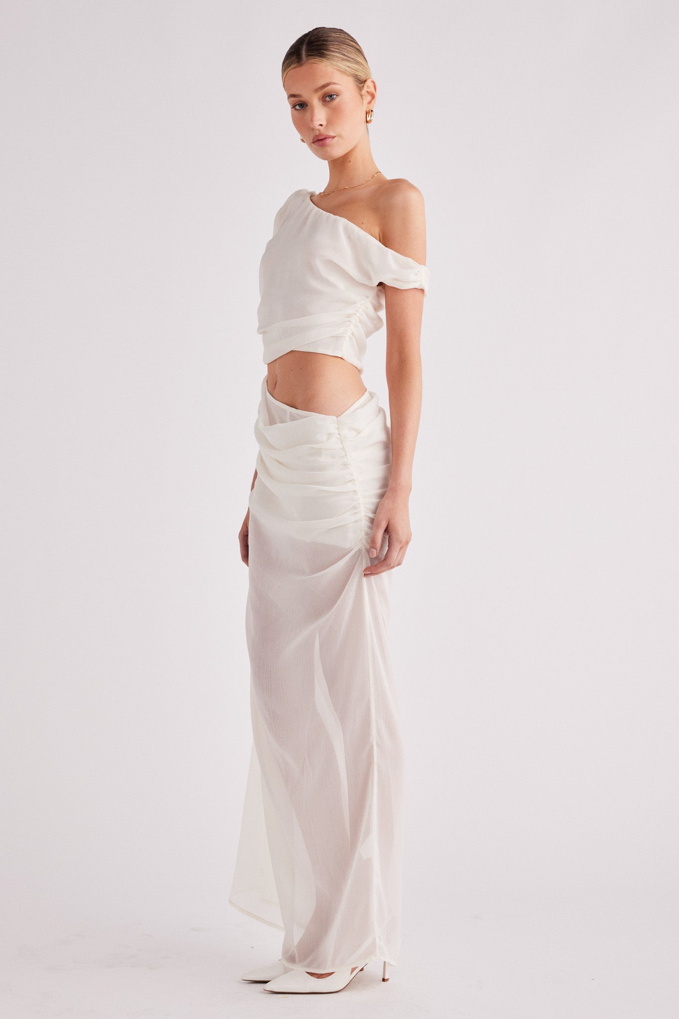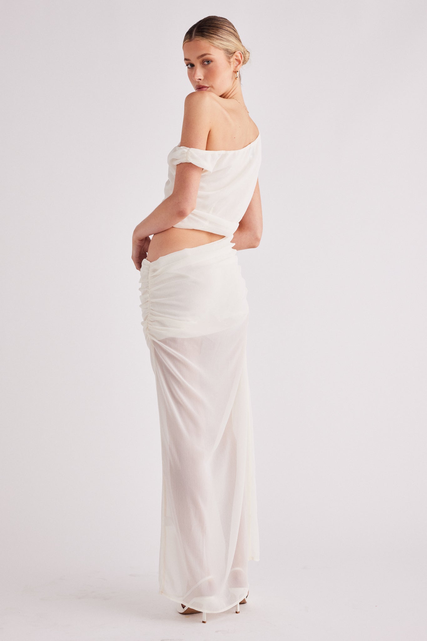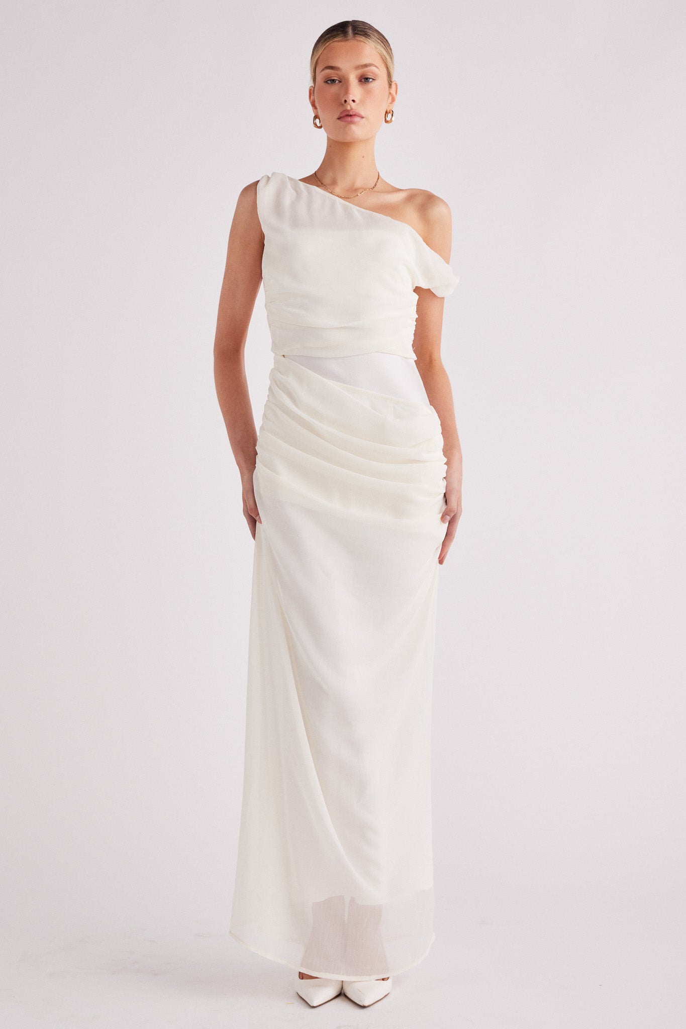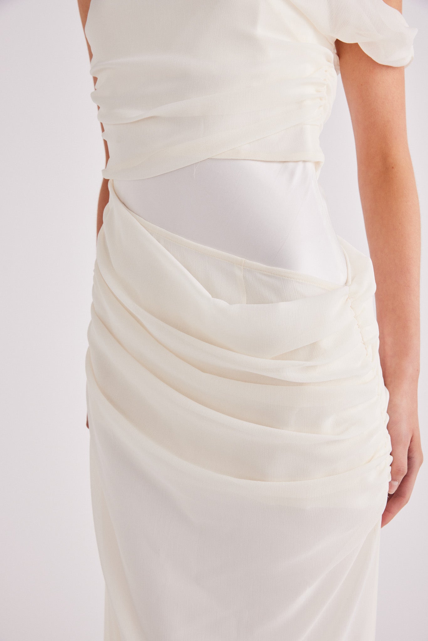 Asymmetrical off shoulder neckline with drape fold detailing on shoulder