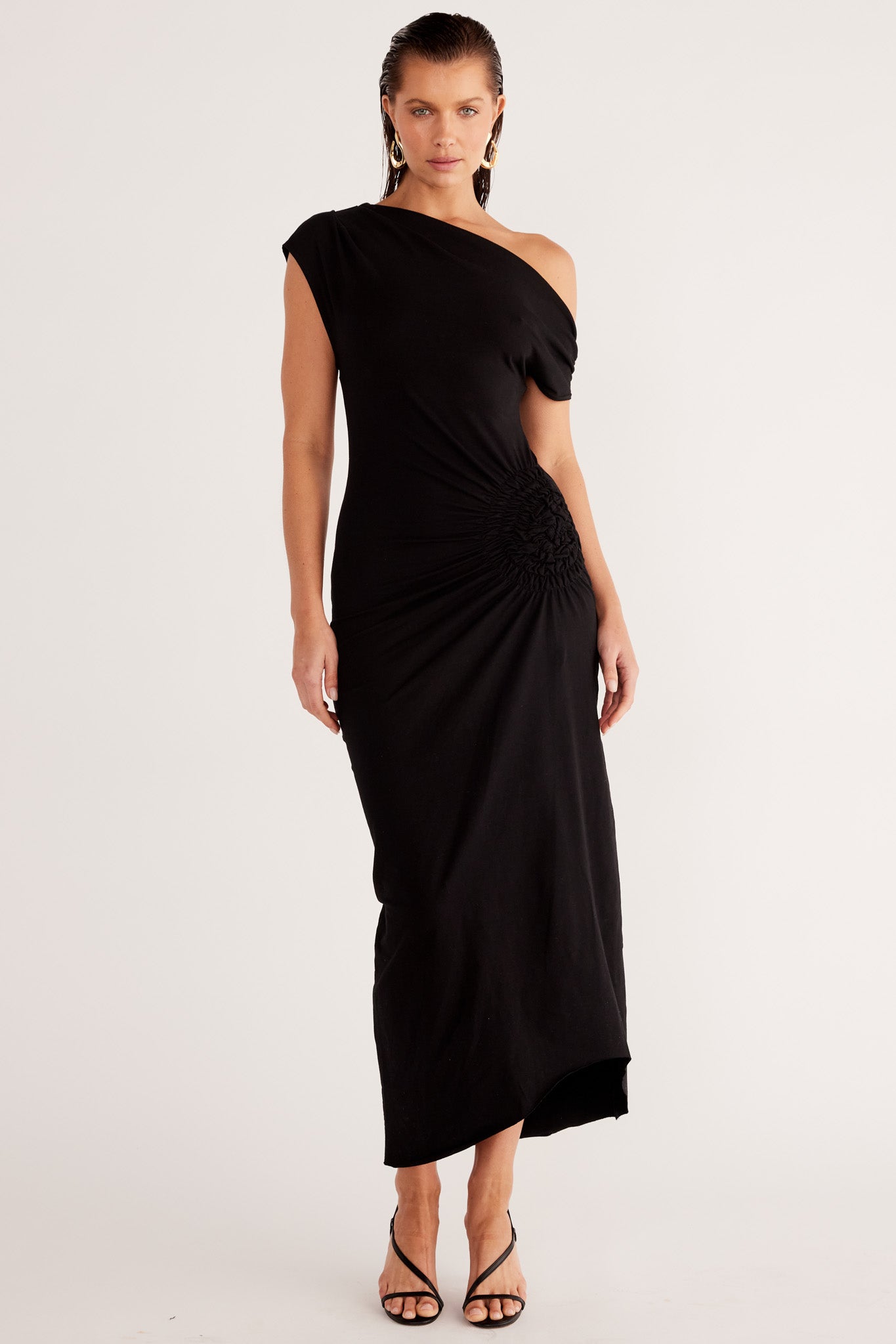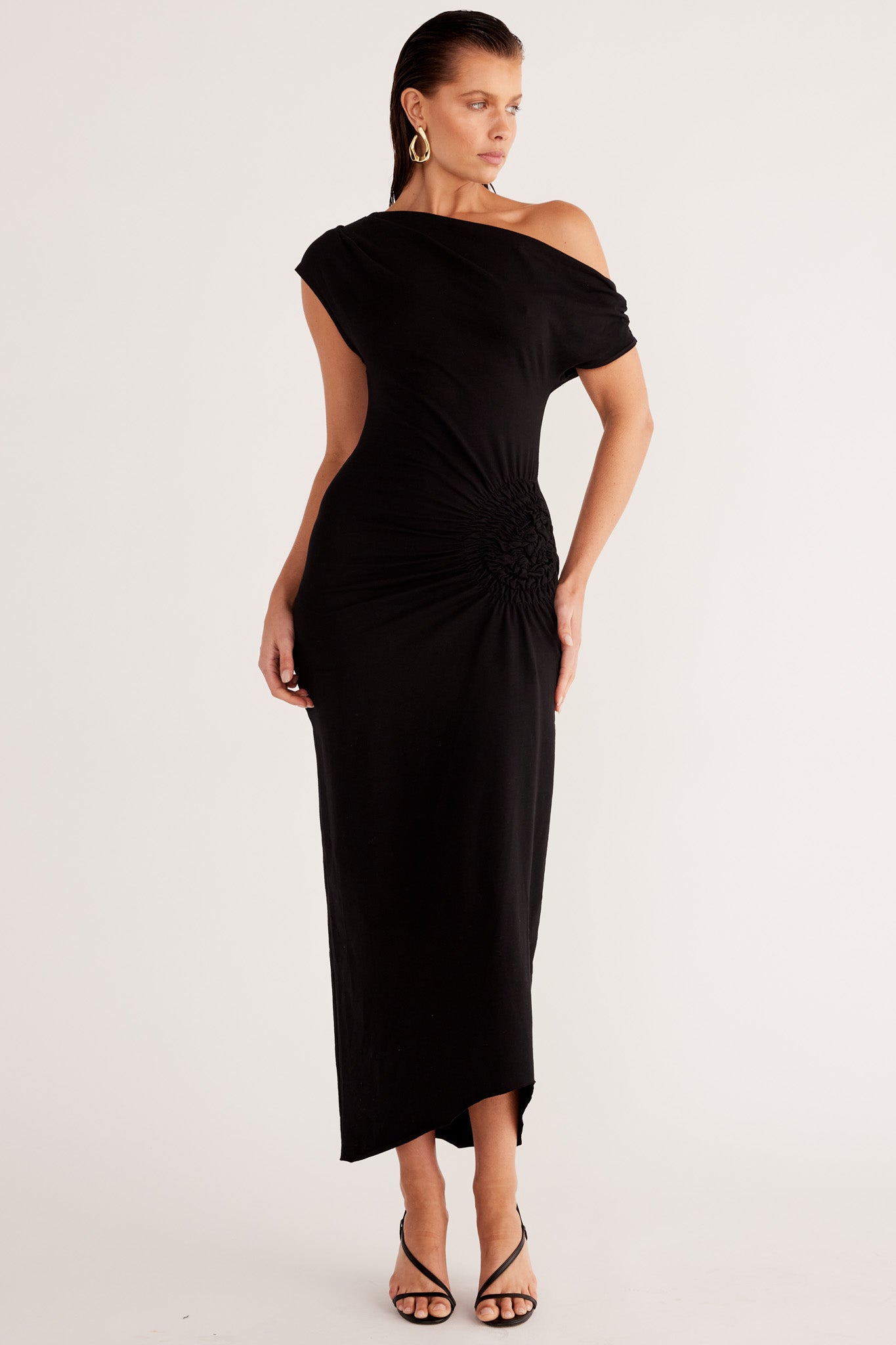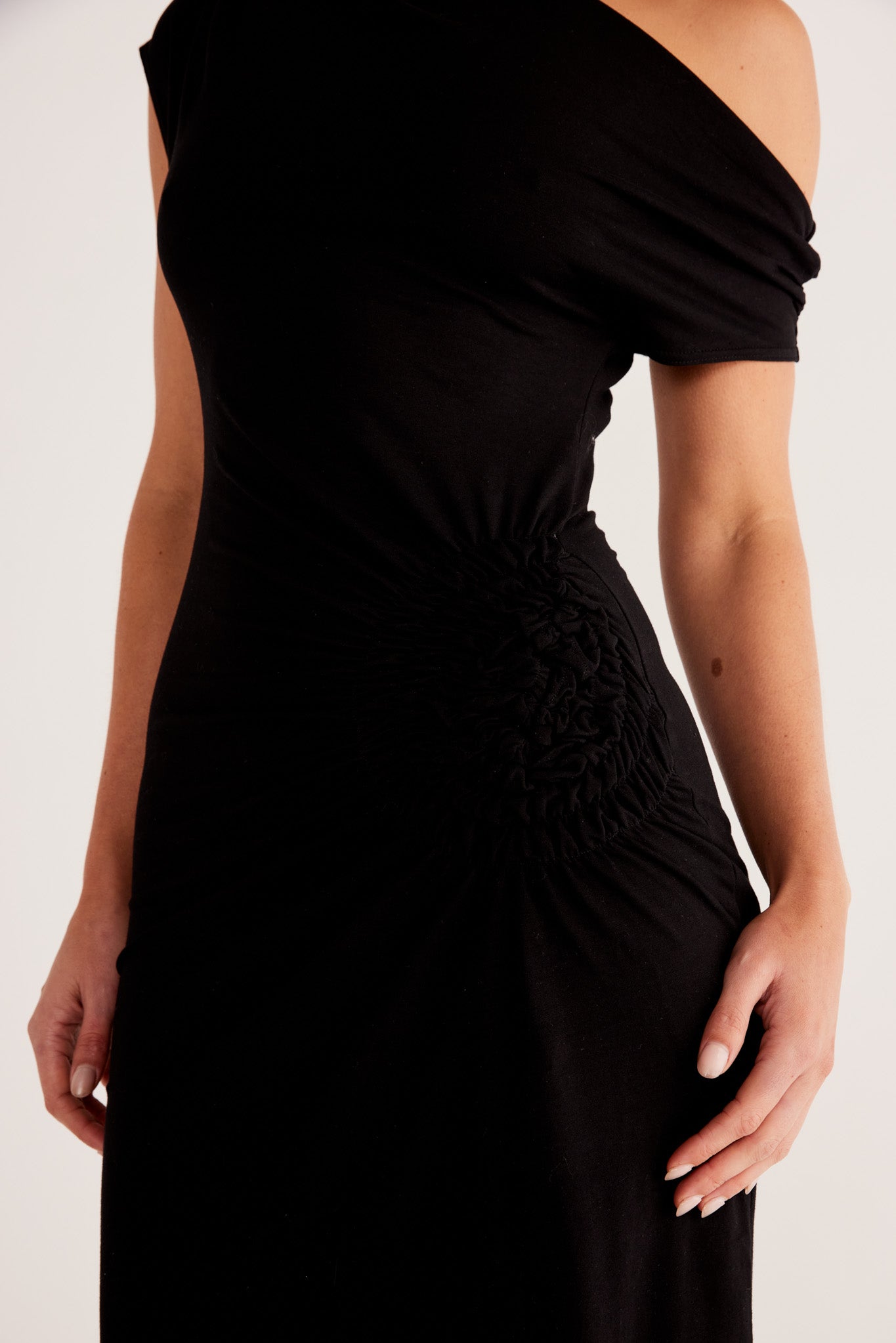 Asymmetrical neckline with shoulder seam gathers