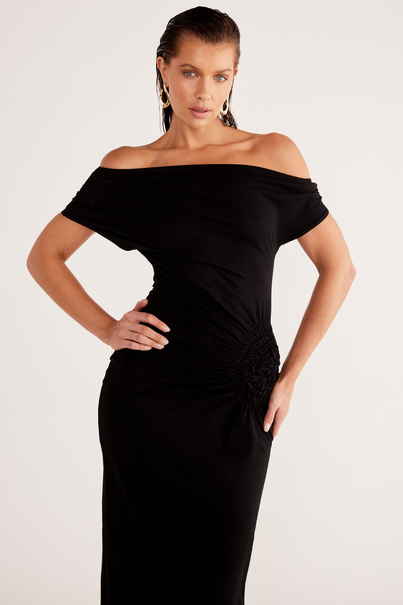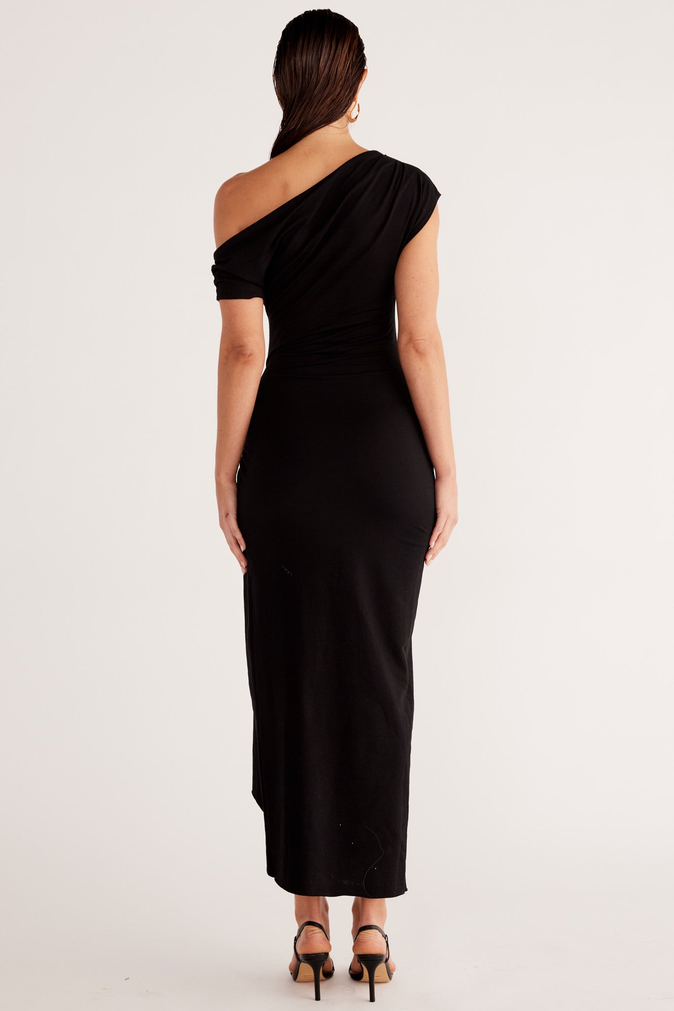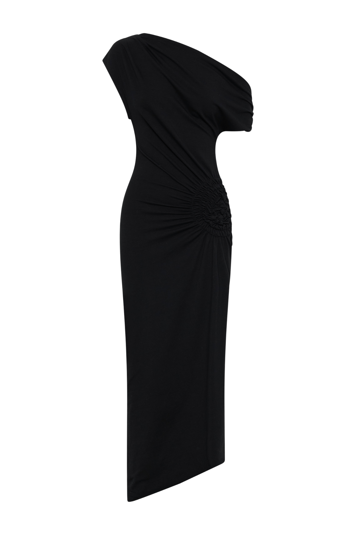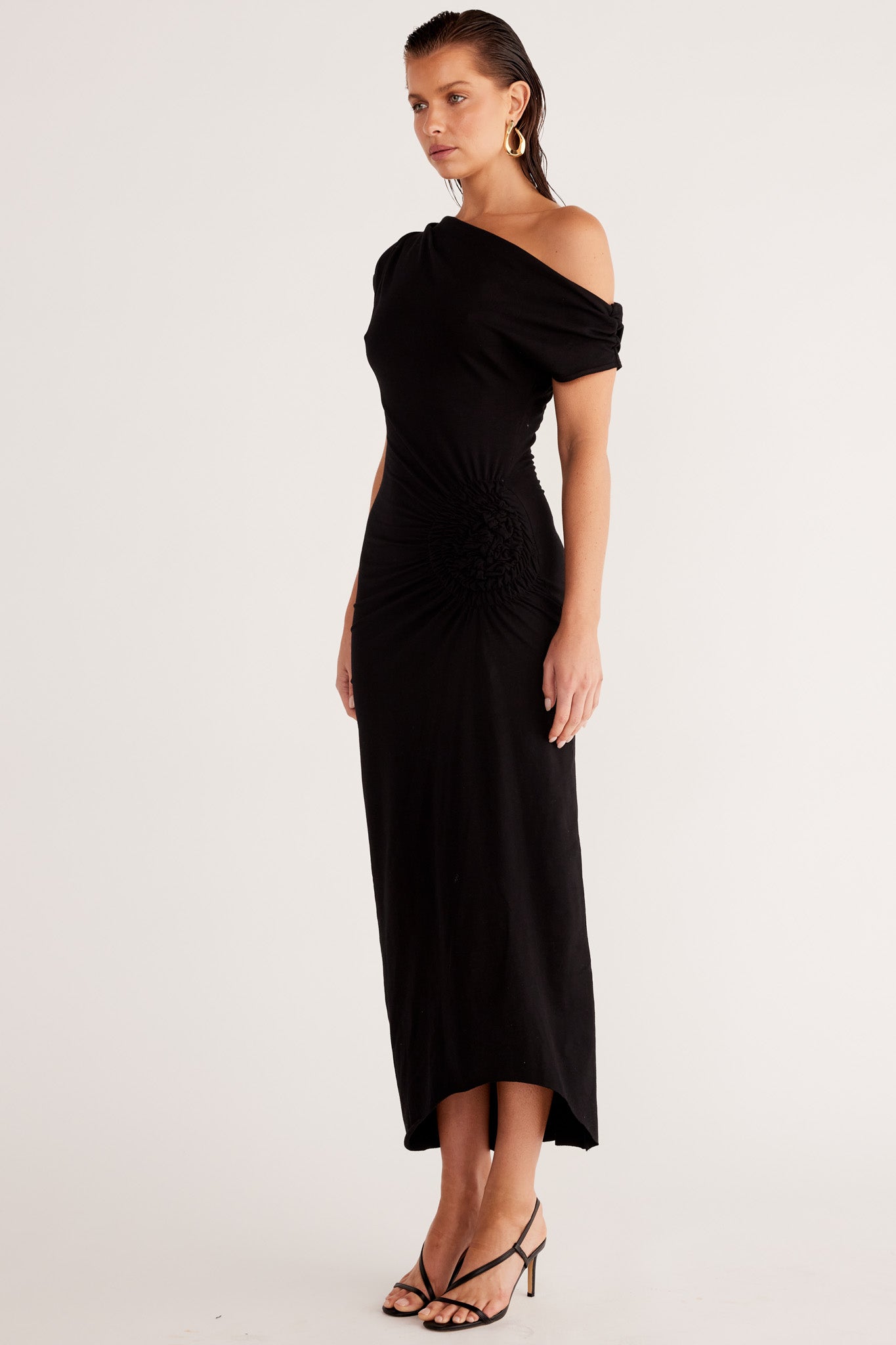 Asymmetrical neckline with shoulder seam gathers