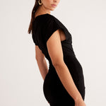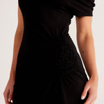 Asymmetrical neckline with shoulder seam gathers